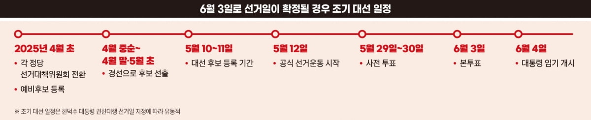 4월 8일 정례 국무회의에서 날짜가 확정될 것이란 관측도 나온다. 박근혜 전 대통령이 2017년 3월 10일 파면될 당시 황교안 대통령 권한대행은 탄핵 인용 5일 뒤인 3월 15일 임시 국무회의에서 조기 대선 일정을 발표한 바 있다.정치권에선 6월 3일 화요일 조기 대선이 치러질 것이라는 전망이 유력하다. 각 당이 경선 등을 치르고 중앙선거관리위원회가 선거를 준비하는데 적지 않은 시간이 필요하기 때문이다. 8년 전에도 박 전 대통령 탄핵안이 헌재에서 인용된 날로부터 60일을 꽉 채운 2017년 5월 9일 화요일 조기 대선(19대)이 열렸다.