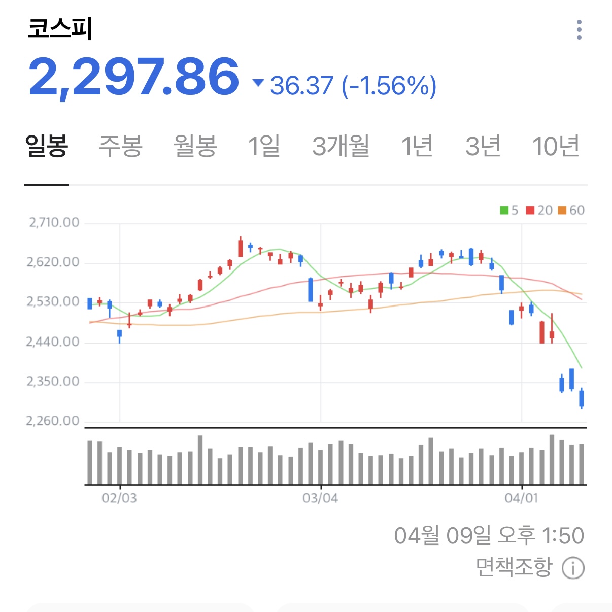 지수는 미국의 상호관세 발효를 앞두고 전장 대비 4.24포인트(0.18%) 내린 2329.99로 출발한 뒤 2320선 인근에서 등락했으나 오후 들어 낙폭이 확대되며 오후 1시께 한때 2300선 아래로 내려갔다.