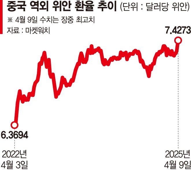 홍콩 시장의 역외 위안 환율은 트럼프의 상호관세가 발효된 9일 장중 달러당 7.4273위안까지 올랐다. 그 결과 위안 가치는 2010년 역외 위안시장 출범 이후 최저 수준으로 내려갔다. 환율은 이후 달러당 7.38위안 선에 머물며 다소 진정세를 보였으나 중국 안팎의 투자자들은 불안감을 지우지 못했다. 인민은행은 지난 8일 역내 위안 환율을 달러당 7.2038위안으로 고시하면서 약 19개월 만에 심리적 '마지노선'으로 여겨지던 7.2위안을 넘기더니, 9일 환율도 7.2066위안으로 고시했다.