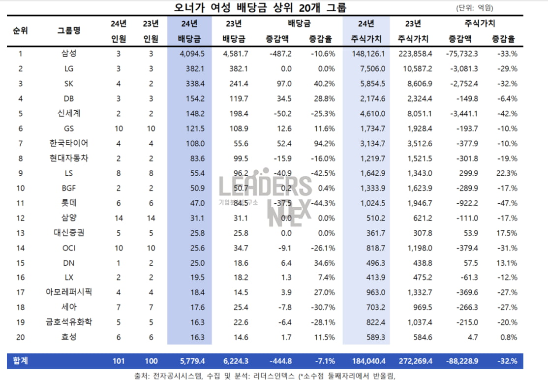 15일 기업분석연구소 리더스인덱스가 발표한 자료에 따르면 2024년 기준 주요 20개 그룹 여성 오너일가 101명이 2023 회계연도에 받은 배당금은 총 5779억4200만 원으로 집계됐다.