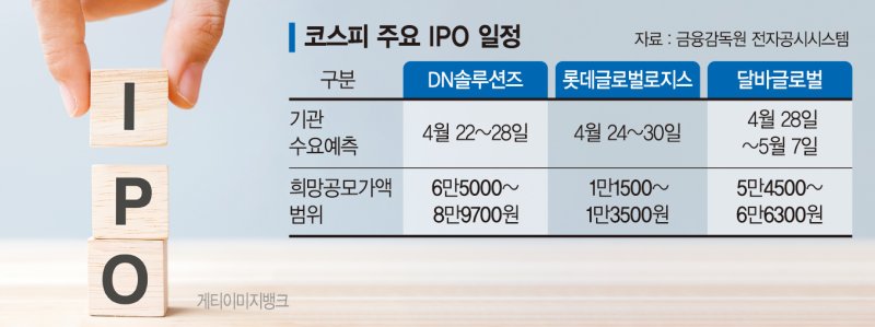 공작기계 제조사인 DN솔루션즈는 이날부터 28일까지 기관 수요예측을 진행한다. 희망 공모가는 6만5000~8만9700원으로, 상단에 확정할 경우 공모 규모는 1조5700억원에 육박한다. 롯데그룹의 물류 자회사 롯데글로벌로지스도 24일부터 30일까지 수요예측을 실시한다. 당초 1조원 이상의 기업가치가 예상됐지만, 상장 후 시가총액은 약 5622억원으로 추산된다. 화장품 기업 달바글로벌은 이달 28일부터 다음달 7일까지 기관 수요예측을 진행한다.
