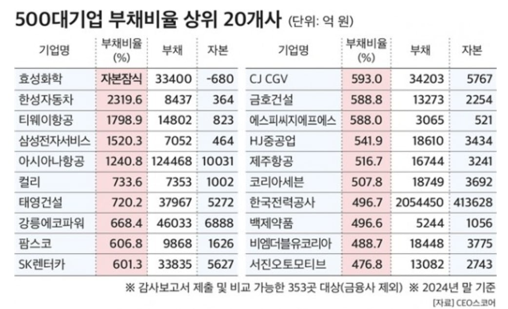 국내 500대 기업 중 절반 이상이 자본보다 부채에 의존하는 구조로 재무건전성에 빨간불이 켜졌다. 특히 효성화학은 유일하게 완전자본잠식 상태에 빠진 것으로 나타났다.