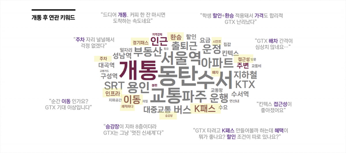 GTX-A 개통 전에는 출퇴근 시간 단축 기대, 부동산과 수혜 지역이 주요 관심사였지만 개통 후에는 실제 이용 경험을 반영한 주차, 배차 등의 온라인 논의가 활성화되는 것으로 나타났다. 인공지능(AI) 분석 전문 업체 뉴엔AI가 ‘GTX-A 온라인 빅데이터 트렌드’를 살펴본 결과다. 뉴엔 AI는 최근 1년간 블로그, 카페, 커뮤니티 등 온라인 채널의 GTX-A 데이터 22만여 건을 통해 이 같은 트렌드를 내놨다.