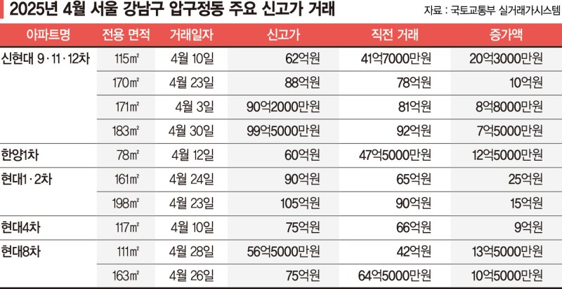 불과 2주 만에 10억 이상이 뛴 아파트도 있다. 한양1차 전용 78㎡는 4월 12일 60억원에 거래됐다. 직전 거래는 3월 29일 47억5000원으로, 12억5000만원이 오른 것이다. 100억원이 넘는 고가 아파트도 등장했다. 압구정 현대1·2차 전용 198㎡는 지난달 23일 105억원에 거래됐다. 신현대 9·11·12차 전용 183㎡는 99억5000만원에 손바뀜하며 100억원에 근접한 금액에 거래됐다.