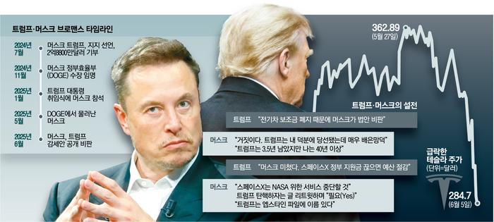 한때 최고의 ‘브로맨스’를 자랑하던 도널드 트럼프 미국 대통령과 일론 머스트 테슬라 최고 경영자(CEO)의 관계가 서로에 대한 원색적인 비난과 함께 파국을 맞았다.