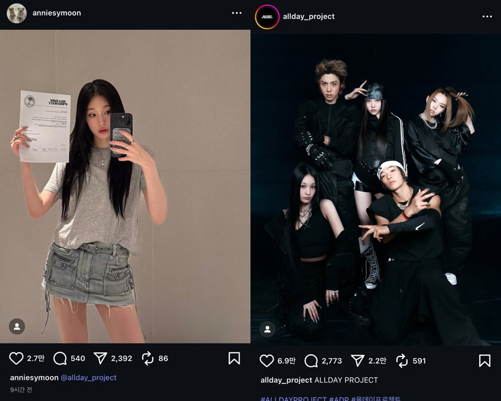 올데이 프로젝트는 5인조 혼성그룹으로, 문서윤 씨는 여성 멤버 3명 가운데 1명으로 포함됐다. 문 씨는 정유경 신세계 회장과 문성욱 신세계인터내셔날 부사장의 장녀다. 정용진 신세계 회장의 조카이기도 하다. 한편, 문 씨와 함께 타잔, 베일리, 우찬, 영서 등 5명으로 구성된 올데이 프로젝트는 오는 23일 공식 데뷔한다. 올데이 프로젝트는 테디 걸그룹으로 불리는 미야오에 이은 더블랙레이블의 두 번째 아이돌 그룹이다.