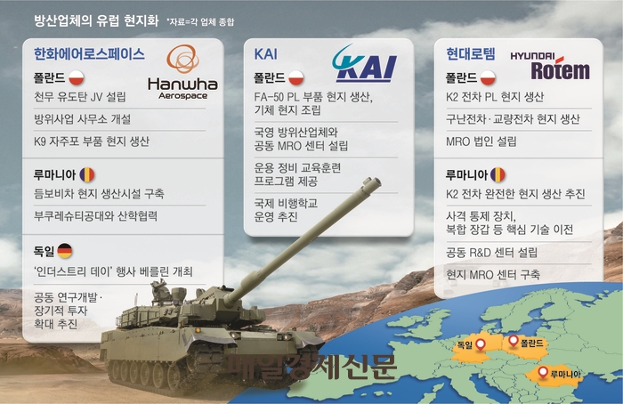 수출이 아닌 현지화에 나선 것은 유럽 국가들이 국방비로 유럽연합(EU) 소속 국가의 무기를 구매하도록 한다는 방침 때문이다. 이에 한국 방위산업체들은 유럽 지역에 생산시설을 추가하고 유럽 업체와 조인트벤처(JV)를 설립하는 식으로 현지화를 적극 추진하고 있다. 방산업체 관계자는 “현지화가 선택이 아니고 필수라는 결정을 내렸고, 업계 전체의 유럽 현지 투자 계획도 조 단위를 넘어서고 있다”고 전했다.