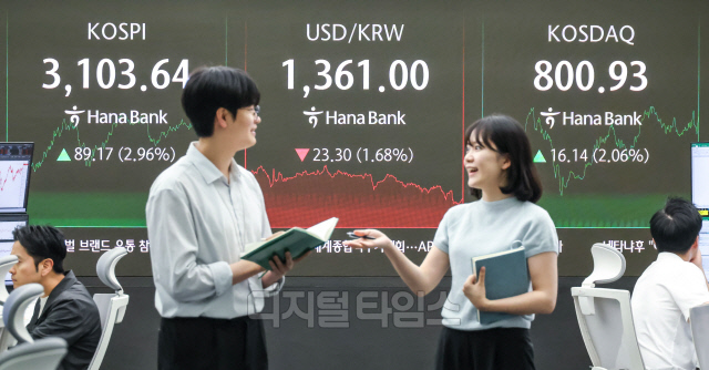 최근 국내 증시가 활황을 보이자 투자 자금이 주식 시장으로 모이는 모양새다. 이날 코스피 지수는 전장보다 2.96% 급등해 3103.64로 장을 마감했다. 코스피 지수가 3100선을 넘은 건 3년 9개월 만이다. 코스닥 지수는 2.06% 오른 800.93을 기록, 약 11개월 만에 800선 위에서 장을 마쳤다.