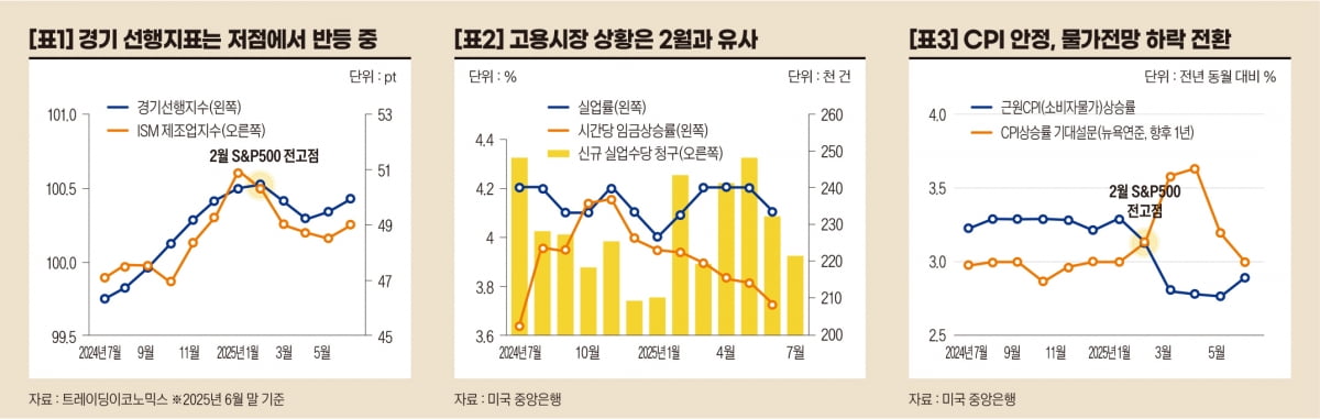 [표1]은 가장 대표적인 선행지표인 종합경기선행지수와 ISM 제조업지수의 2024년 7월부터의 추이이다. 올해 6월 현재 두 지표 모두 전고점 대비 낮은 수준에 있으나 주가 전고점인 2월에는 고점에서 하락이 시작된 모습이었고 최근에는 단기 저점에서 반등하는 모습으로 경기모멘텀 측면에서는 2월 대비 긍정적으로 해석할 수 있다.[표2]는 2024년 7월부터 신규 실업수당 청구건수, 실업률, 그리고 시간당 임금상승률 추이이다. 이러한 고용 관련 지표들은 미국 경제의 70%를 차지하는 소비를 결정짓는다는 측면에서 중요한데 전체적인 상황은 올해 2월과 현재가 유사한 편이다.