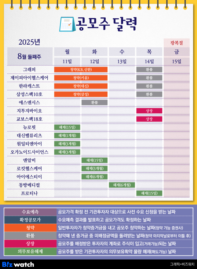 이밖에 기업인수목적회사인 삼성스팩10호도 10~11일 청약을 실시해요. 이번주 청약을 실시하는 4개사의 청약증거금 환불일은 광복절 전날인 14일이에요.
