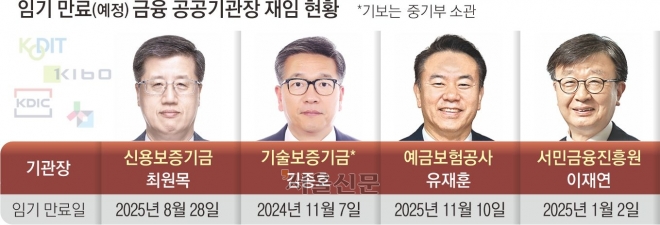 우선 보증 업무가 중첩되는 신용보증기금(신보)과 기술보증기금(기보)의 통합 운영 필요성은 꾸준히 제기돼 왔다. 최원목 신보 이사장 임기는 28일 종료된다. 신보는 지난 6월 말 새 이사장을 뽑기 위한 임원추천위원회를 꾸렸지만, 진도가 나가고 있는 상황은 아니다. 문재인 정부 때 임명된 김종호 기보 이사장은 지난해 11월 임기가 만료됐지만 아직 자리를 지키는 중이다. 기보는 이날 6대 지역거점은행과 생산적 금융을 위한 업무협약을 맺는 등 존재감을 드러내는 모습이다. 신보는 소관 부처가 금융위이고, 기보는 지난 2017년 중소벤처기업부로 이관된 상태다.