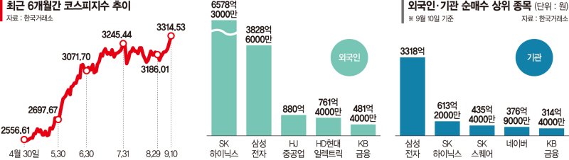 10일 한국거래소에 따르면 이날 코스피지수는 장중 57.72p(1.77%)오른 3317.77까지 치솟아 역대 최고치를 갈아치웠다. 이날 3314.53으로 마감해 종가 기준으로도 지난 2021년 7월 6일 3305.21 이후 약 4년3개월 만에 새로운 역사를 다시 썼다.