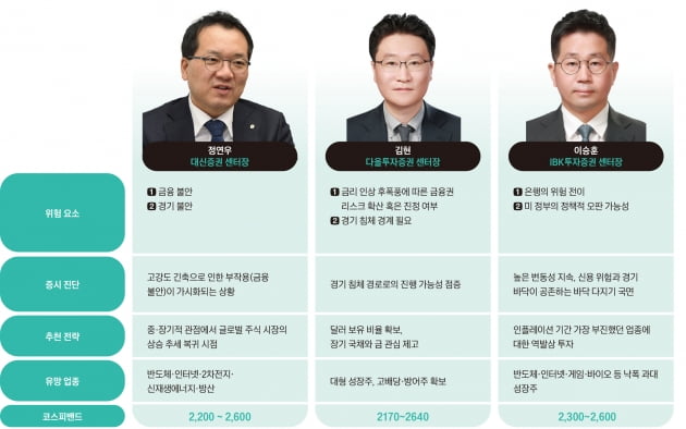 지금은 물가 안정을 위해 글로벌 중앙은행들의 긴축을 견뎌내는 국면이다. 이경수 메리츠증권 센터장은 “올해 하반기는 인플레이션이 재차 가속화되거나 경기 회복의 강도가 지금 시장의 기대에 미치지 못할 가능성이 지수를 압박할 것”이라고 말했다. 서철수 센터장 역시 “일단 긴축이 마무리될 필요가 있고 이후 경기와 실적 개선 기대감이 확산되기 전까지는 추세장이라고 판단하기는 어렵다”고 말했다.
