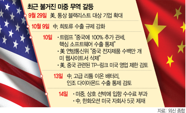 이날 중국 상무부는 한화오션의 미국 자회사 다섯 곳을 겨냥한 제재 조치를 발표하며 미중 갈등의 불똥이 한국 기업으로도 옮겨붙었다. 미중 양국의 상호 입항 수수료 부과와 중국이 한화오션의 미국 5개 자회사 제재에 나서며 양국 간 신경전은 고조되는 양상이다. 중국은 9월 희토류 관련 추가 수출통제를 발표했고, 트럼프 대통령은 이달 10일 중국에 100%의 추가 관세를 부과하고 핵심 소프트웨어 수출을 통제하겠다며 반격에 나섰다.
