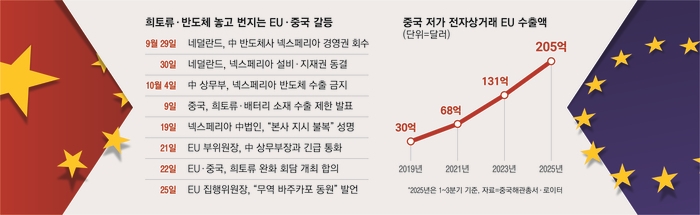 앞서 지난달에는 반도체를 둘러싼 충돌도 발생했다. 네덜란드 정부는 중국 윙텍이 인수한 반도체업체 넥스페리아의 경영권을 사실상 장악하고 핵심 자산과 지식재산권을 동결했다. 이에 중국 상무부는 넥스페리아 중국 공장의 반도체 수출을 전면 금지했고, 넥스페리아 중국 법인은 “본사의 지시를 따르지 않겠다”고 반발했다. EU는 이 사안을 공급망 안보 리스크의 대표 사례로 다루며 논의를 확대했다.