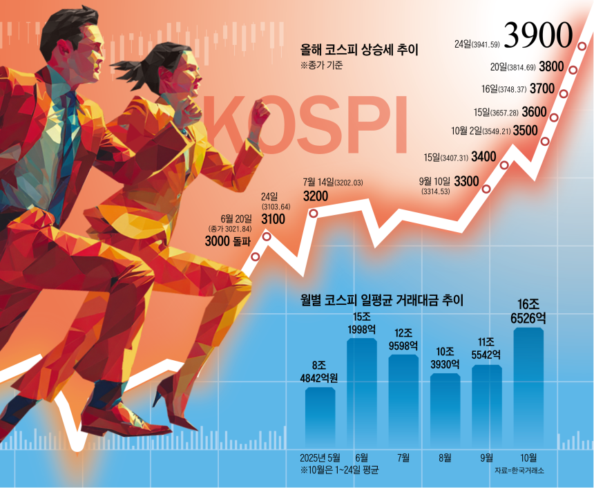 사상 처음으로 코스피 4000선 돌파를 눈앞에 두면서 투자자들의 기대감이 주식시장으로 몰려드는 모습이 나타나고 있다. 지난 24일 코스피는 3941.59에 마감, ‘4000 고지’에 불과 60포인트도 채 남지 않았다.