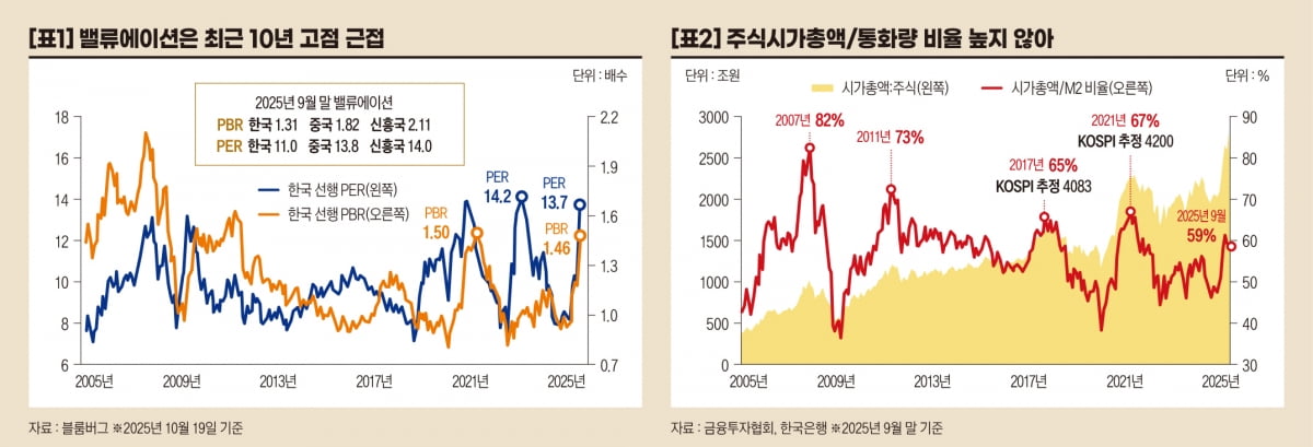 예를 들어 한국 시장 밸류에이션이 상향 재평가되어 9월 말 기준 신흥국(이머징마켓) 수준(PBR 2.1)까지 이른다면 KOSPI는 최고 5516까지 오를 수 있고 중국(PBR 1.8) 수준까지만 올라도 KOSPI는 4758까지 상승이 가능하다.[표2]는 2005년 초 이래 주식시가총액을 통화량 M2로 나눈 비율(%) 추이이며 수치가 높을수록 고평가된 것이다. [표1]과 마찬가지로 2007년과 2011년을 버블 시기로 보아 제외하면 이후 최고점은 2021년의 67%이다.