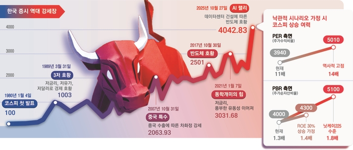 코스피는 대형 수출주의 업황 상승 국면에선 강렬한 상승세를 보여왔지만 사이클 업종의 특성상 상승 기간은 짧고 횡보장이나 하락장은 오래 이어져 이에 지친 개인투자자들이 국내 증시를 떠나기도 했다. 그러나 이번 반도체가 주도하는 사이클은 다르다는 기대가 나온다. 인공지능(AI) 투자가 주도하는 생태계가 구조적인 상승장을 만들 수 있기 때문이다. 이렇게 되면 코스피는 기존에 받았던 밸류에이션의 최상단을 다시 기록할 수 있고 5000선 돌파가 가능하다는 추정도 나온다.