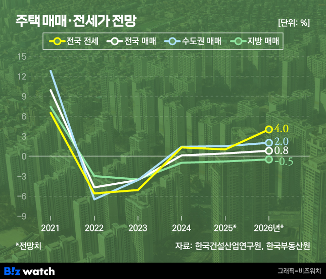 한국건설산업연구원은 지난 4일 열린 '2026년 건설·자재·부동산 경기전망 및 시장 안정·지속가능성 확보 세미나'에서 내년 전국 주택 매매가격은 0.8%, 전세가격은 4.0% 상승할 것으로 내다봤다.