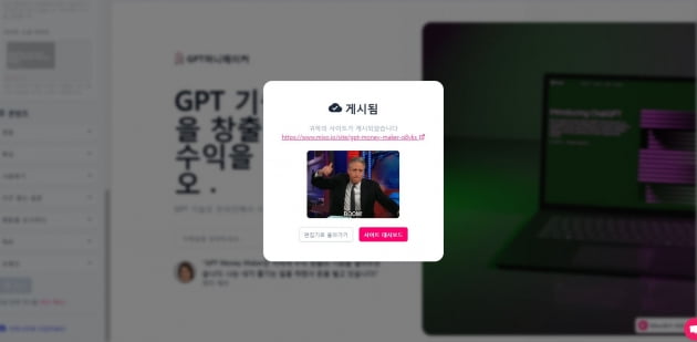 이 문장 다음에 원하는 방향의 웹사이트를 지시하면 웹사이트 개설할 수 있는 코드가 생성된다. 이때 원하는 방향을 상세하게 설명할수록 한 번에 완벽한 웹사이트를 만들 수 있다.