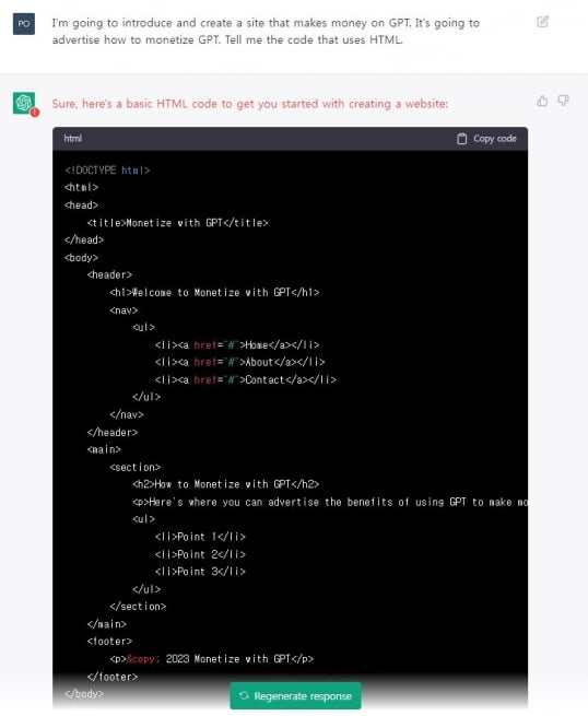 이 역시 방법은 간단하다. 챗GPT란 개발자에게 코드를 문의하는 방식이다. 챗GPT에 접속해 어떠한 웹페이지를 제작하고 싶은지 설명하고 이 웹페이지의 코드를 알려 달라고 하면 된다. 그러면 챗GPT가 엄청난 수식의 코드를 단 몇 초 만에 완성한다.