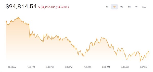 가상자산 시가총액 1위인 비트코인이 6개월 만에 9만5000달러 아래로 떨어졌다.