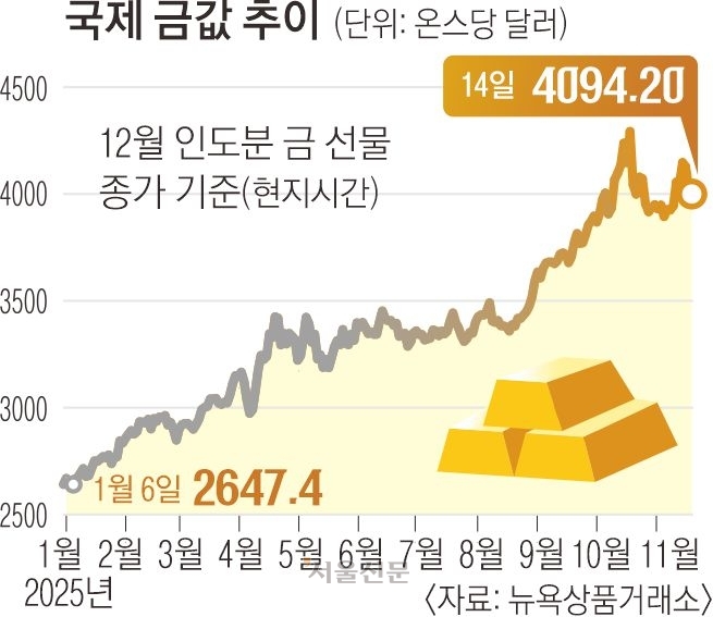 14일(현지시간) 뉴욕상품거래소(COMEX)에서 12월물 국제 금 선물은 온스당 4094.20달러로 마감해 전장 대비 2.39% 급락했다. 지난 12일에는 미국 연방정부 셧다운 종료 기대감을 반영해 4213.60달러에 마감했지만, 연준의 매파적 기조가 재확인되자 이틀 만에 상승분을 모두 반납했다. 같은 날 금 현물도 4079.58달러에 마감하며 하루 전 2.20% 상승 폭을 반납했다.