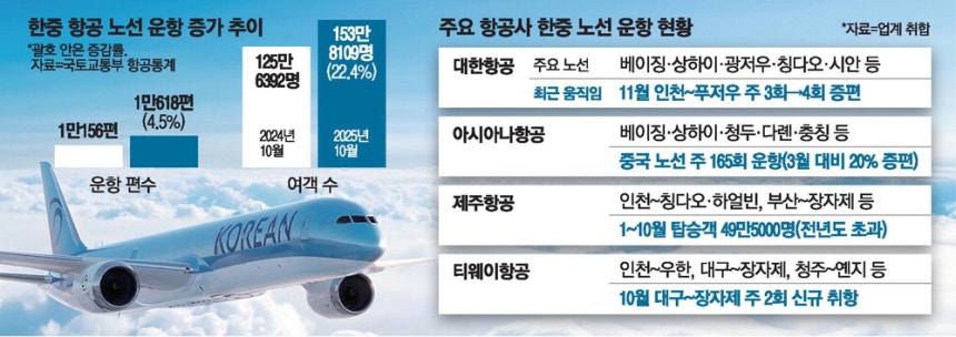저비용항공사(LCC)들도 중국 노선 공략을 강화하고 있다. 제주항공은 올해 1~10월 중국 노선 탑승객이 49만5000명으로 작년 한 해 수준을 이미 넘어섰다. 티웨이항공도 인천~우한, 대구~장자제 등 지방공항 중심으로 중국 소도시 노선을 확대하고 있다.