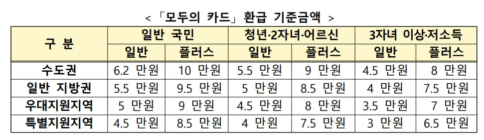 기존 K-패스는 한 달에 15회 이상 대중교통을 이동할 경우 월 최대 60회까지 지출 금액의 일부를 돌려주는 서비스다. 일반인은 20%, 청년(19~34세)은 30%, 다자녀(2명 30%·3명 이상 50%)와 저소득층은 53.5%를 돌려준다. 지출 총액 중 20만원 초과분에 대해서는 50%만 환급됐다.‘모두의 카드’ 환급 기준금액은 지역별로 다르게 적용된다. 대중교통 인프라가 지역별로 다르기 때문에 실질적인 혜택을 고려했다.