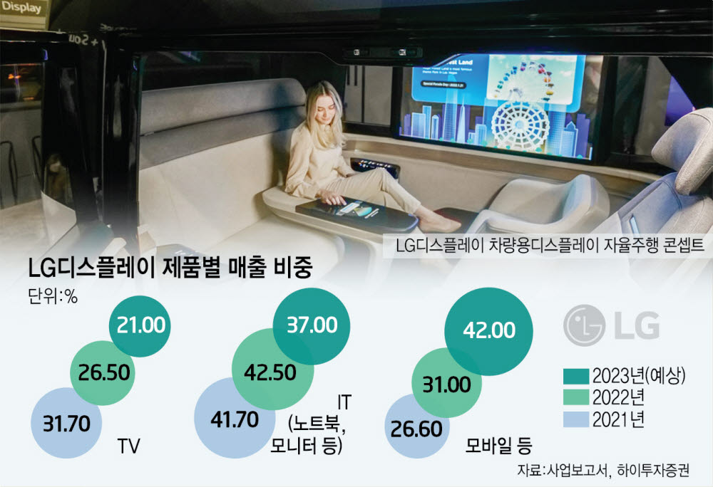 LG디스플레이가 올해 모바일과 차량용 디스플레이 사업 성장을 예고해 주목된다. 전략 고객 수주 확대에 따라 모바일과 차량용 디스플레이 매출 비중이 올해 40%를 돌파할 전망이다. 모바일과 차량용은 LG디스플레이가 그동안 성장동력으로 육성한 제품들로 대형 디스플레이 중심의 사업 구조가 재편될지 관심이 쏠린다.